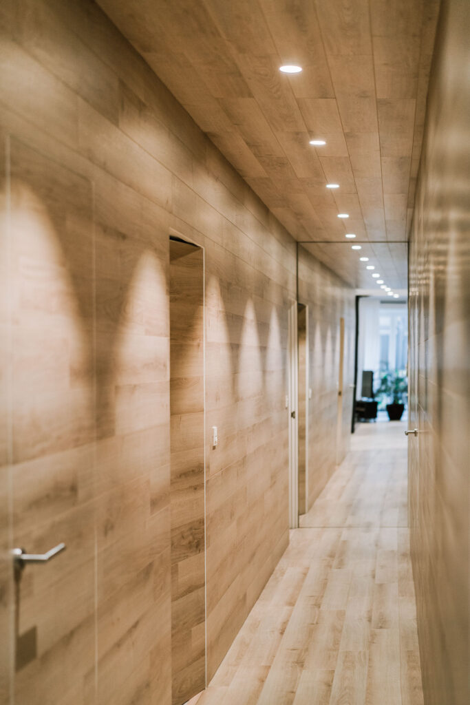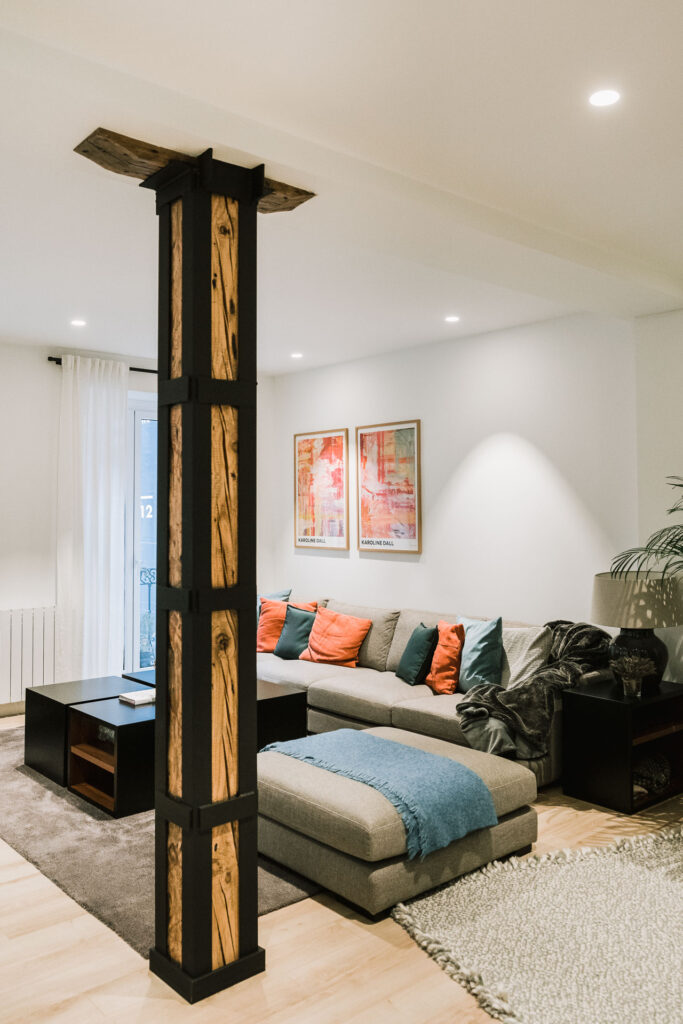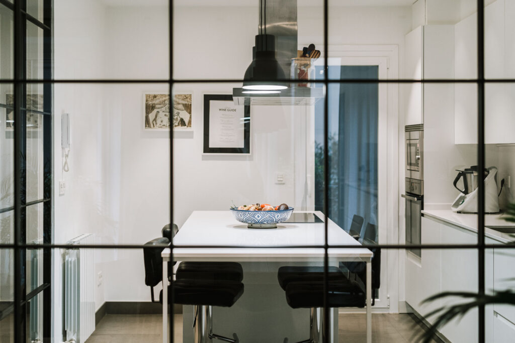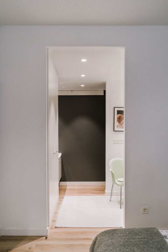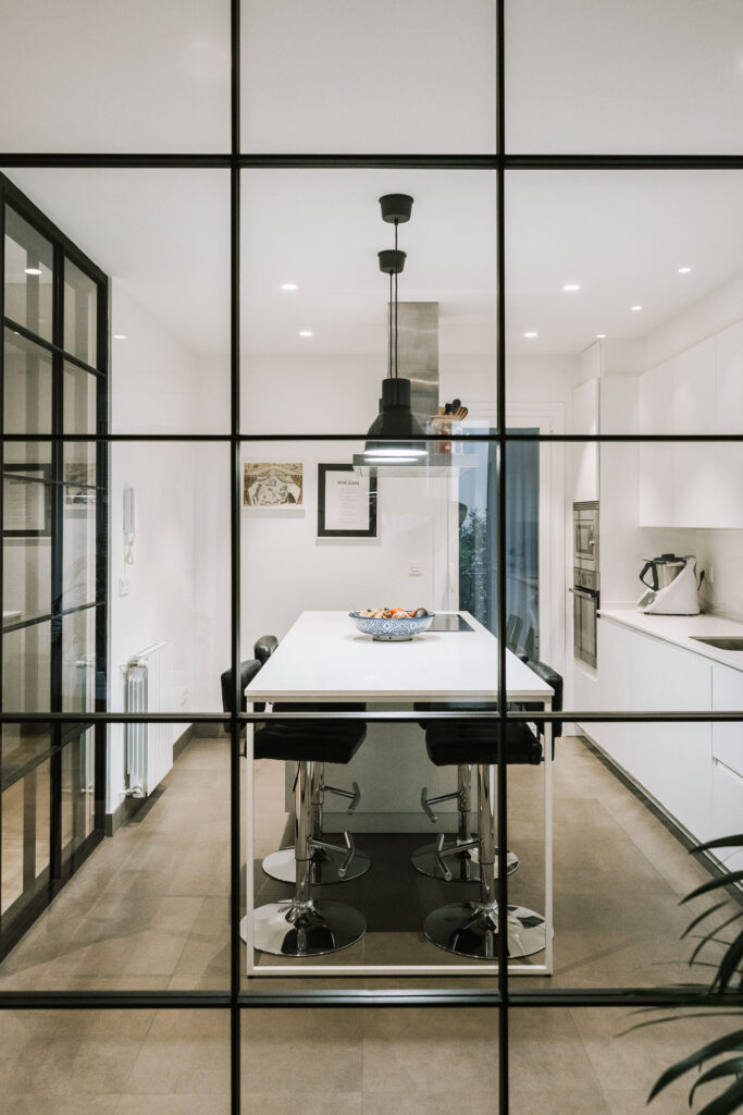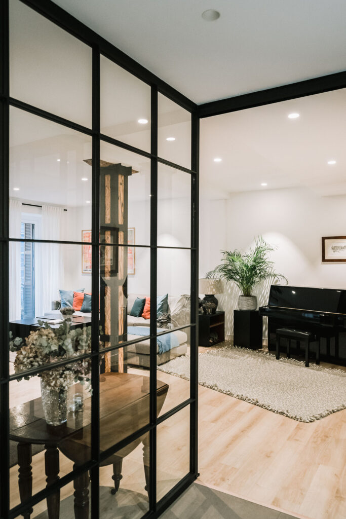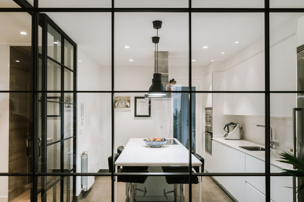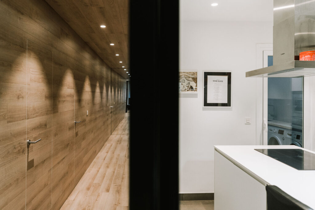 El proyecto de reforma integral de esta vivienda plantea unir dos antiguas viviendas en una única. Orientamos hacia la calle ppal los espacios de día, como son salón, comedor y una gran cocina conectada visualmente, pero cerrada mediante una división de forja y vidrio. Por otro lado, orientamos las habitaciones hacia el patio de manzana que dispone. Esto nos genera un gran pasillo de distribución al que decidimos revestir completamente en madera, inclusive techos y puertas, para crear un cajón de roble que se duplica mediante un espejo situado en el fondo del pasillo. De esta manera, se crea un espacio con juego y distinto a lo que estamos acostumbrados.