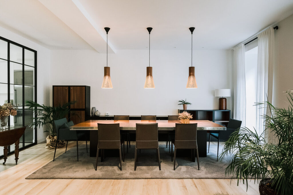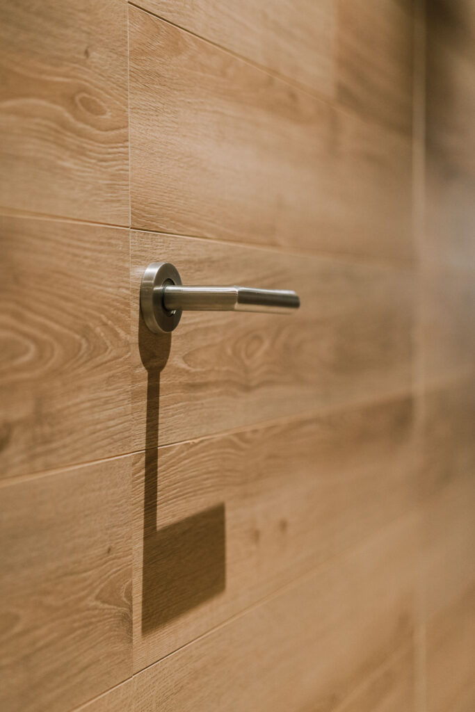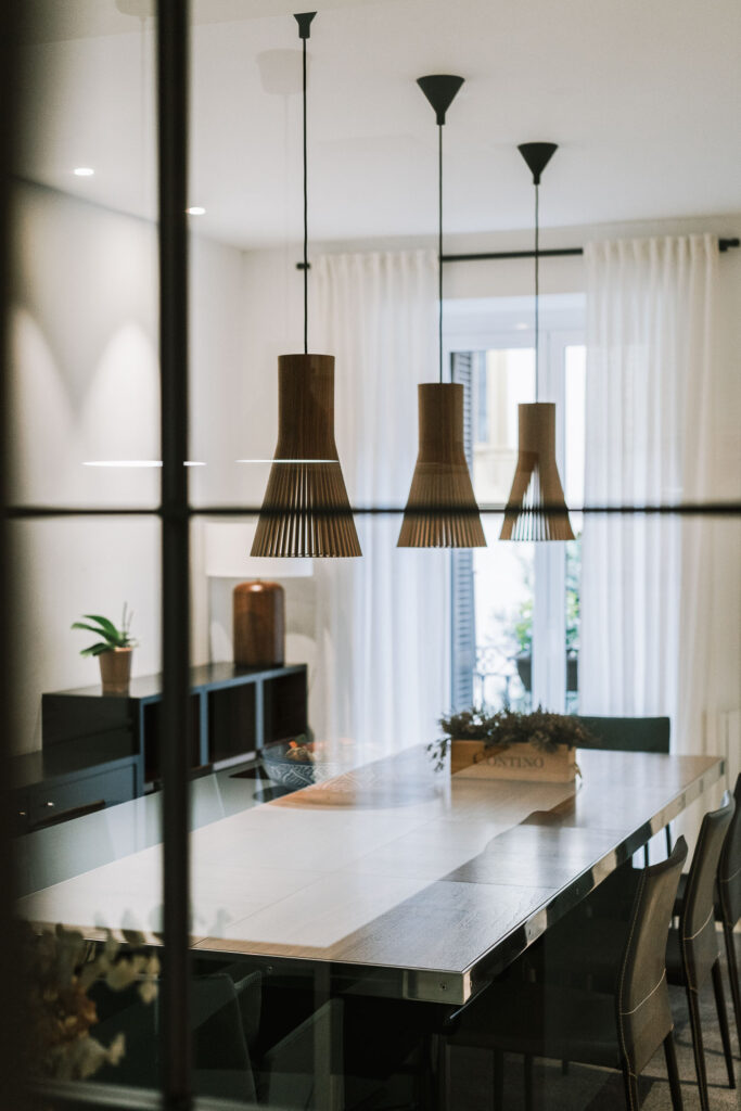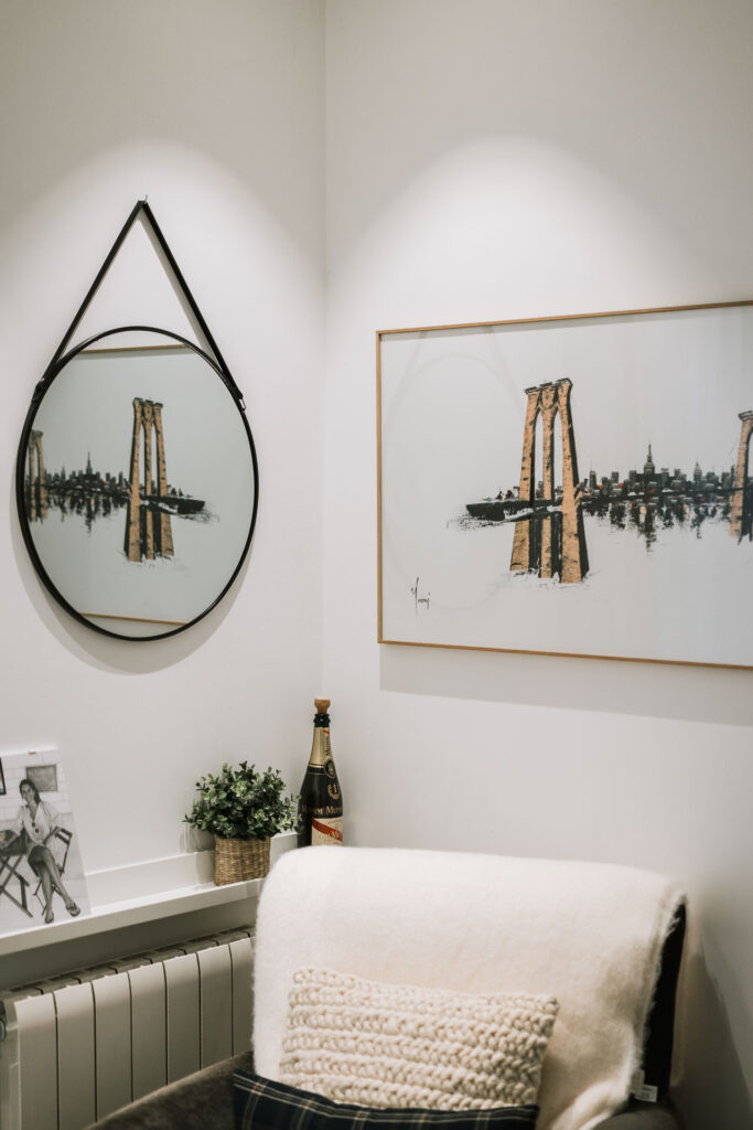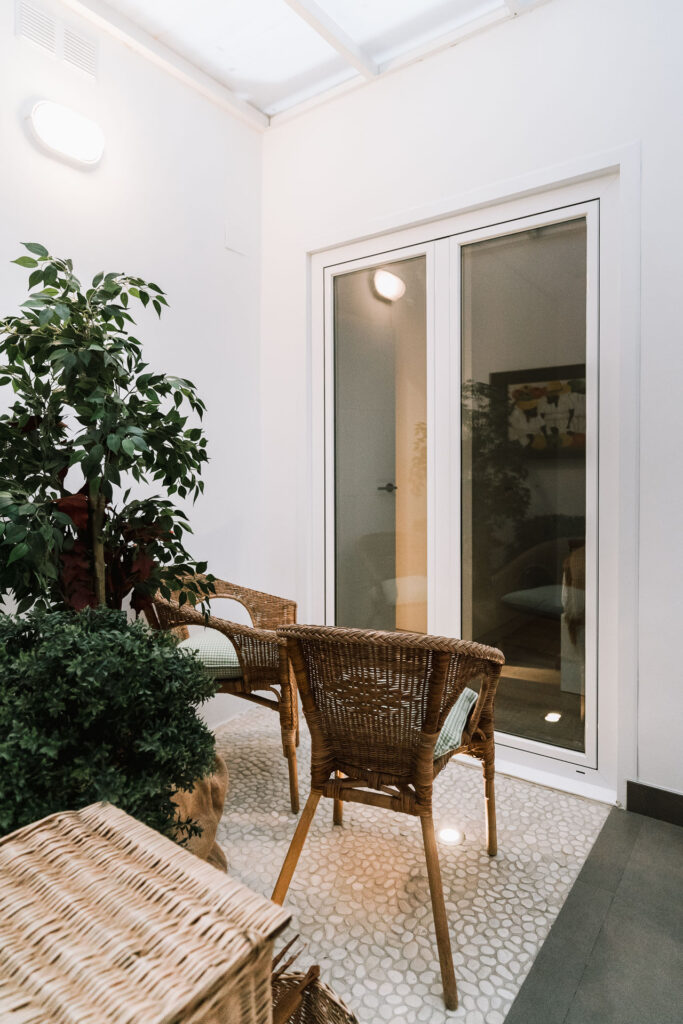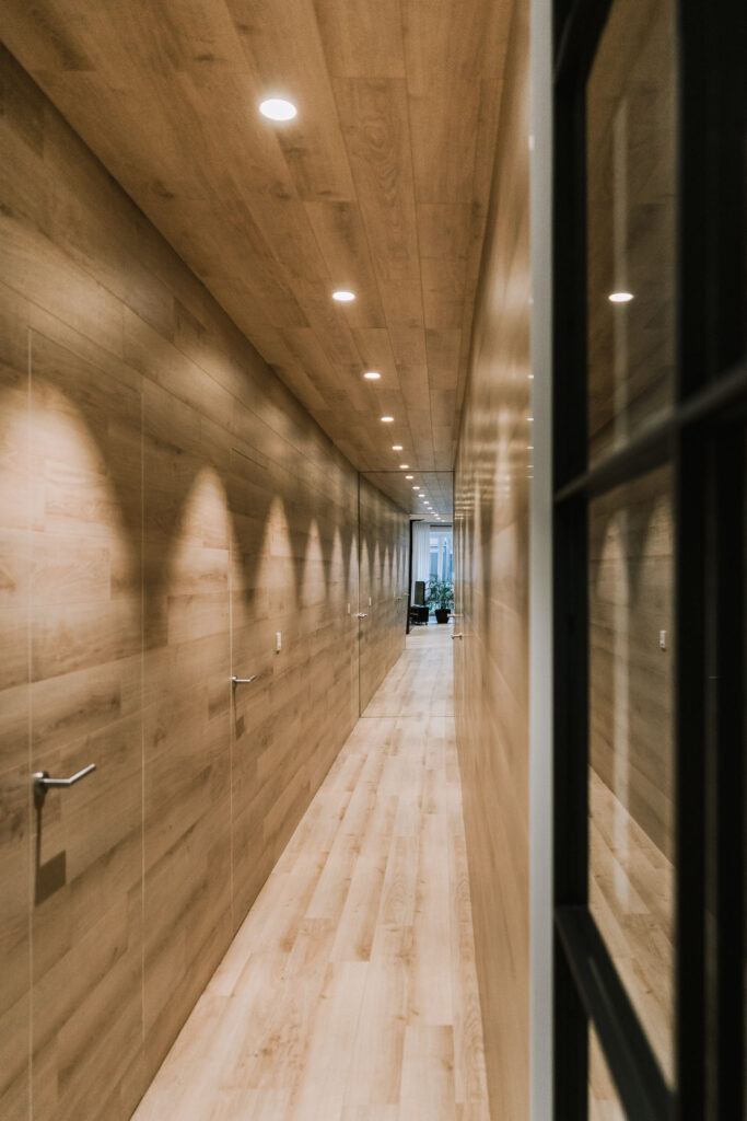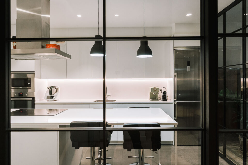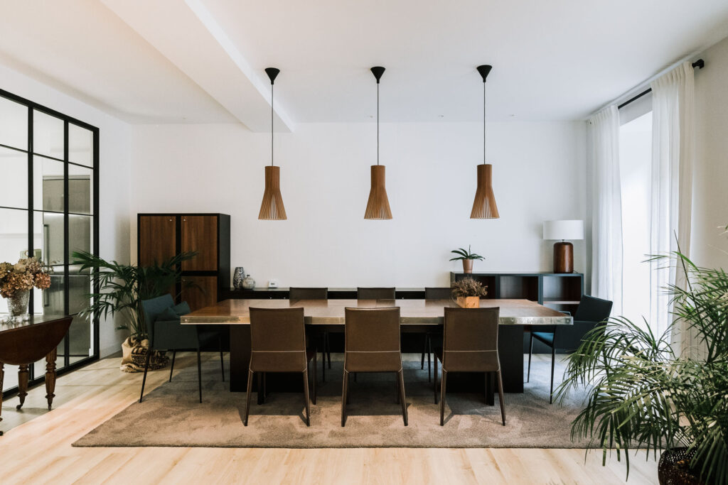 El proyecto de reforma integral de esta vivienda plantea unir dos antiguas viviendas en una única. Orientamos hacia la calle ppal los espacios de día, como son salón, comedor y una gran cocina conectada visualmente, pero cerrada mediante una división de forja y vidrio. Por otro lado, orientamos las habitaciones hacia el patio de manzana que dispone. Esto nos genera un gran pasillo de distribución al que decidimos revestir completamente en madera, inclusive techos y puertas, para crear un cajón de roble que se duplica mediante un espejo situado en el fondo del pasillo. De esta manera, se crea un espacio con juego y distinto a lo que estamos acostumbrados.