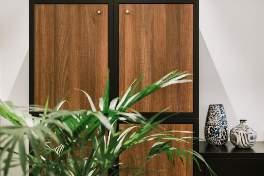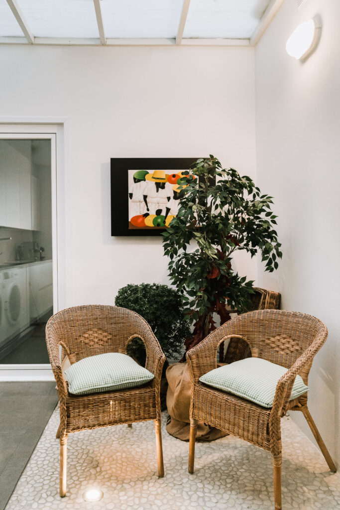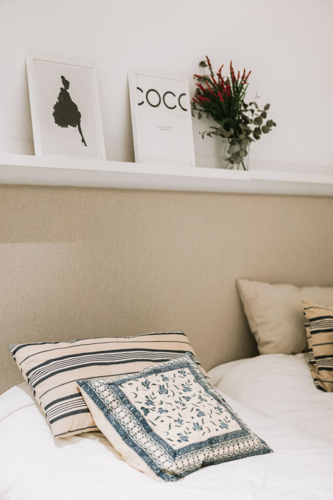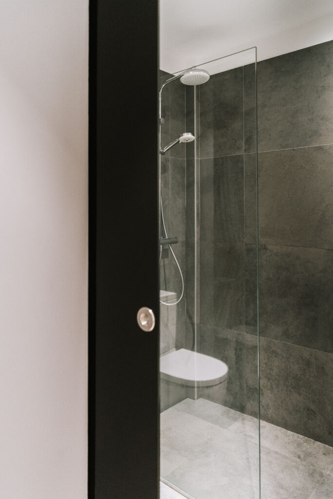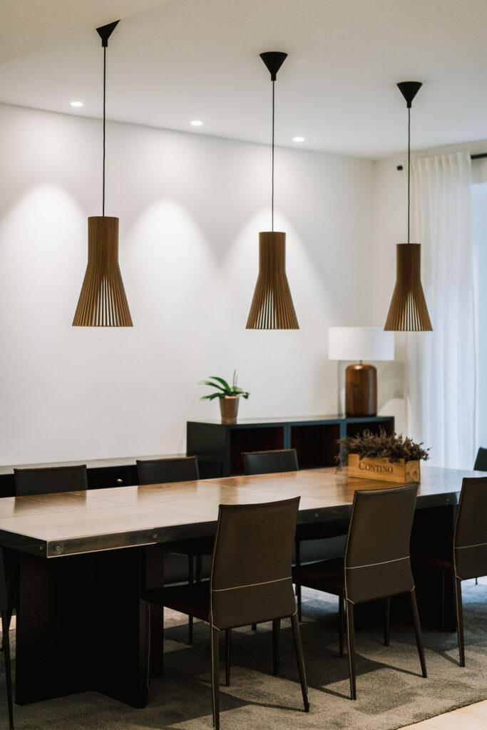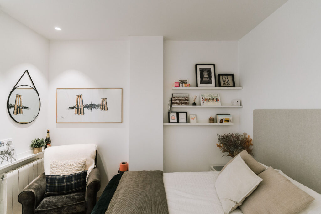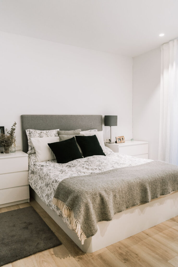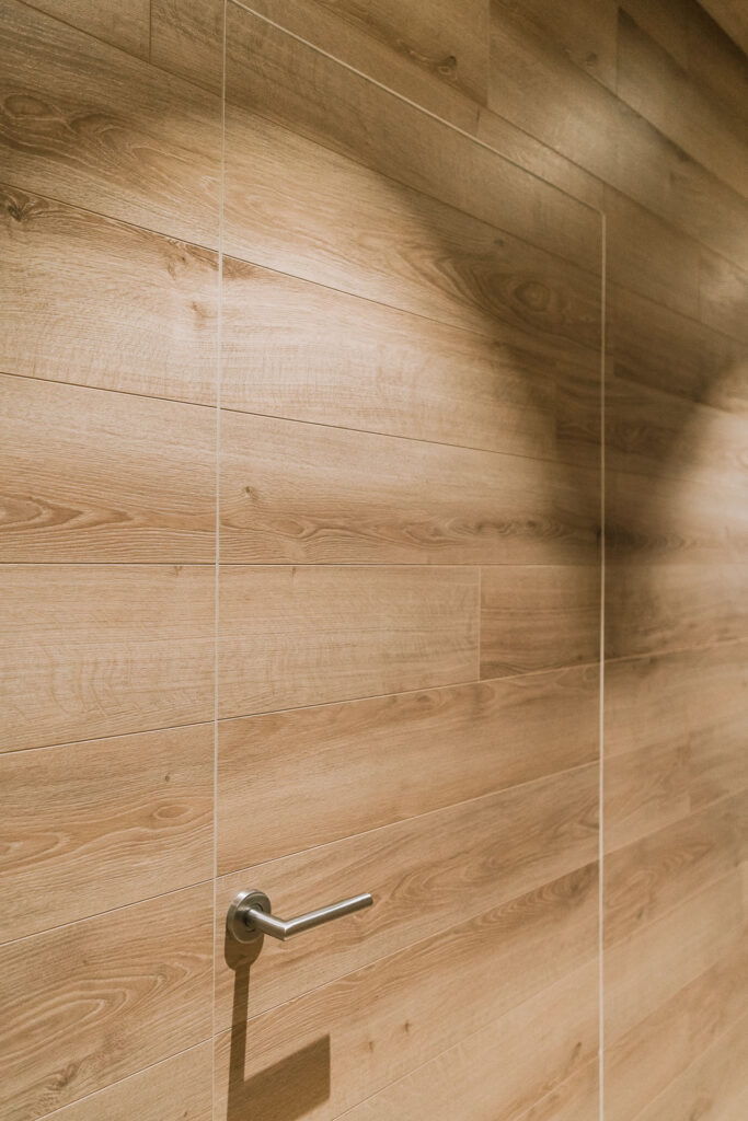 El proyecto de reforma integral de esta vivienda plantea unir dos antiguas viviendas en una única. Orientamos hacia la calle ppal los espacios de día, como son salón, comedor y una gran cocina conectada visualmente, pero cerrada mediante una división de forja y vidrio. Por otro lado, orientamos las habitaciones hacia el patio de manzana que dispone. Esto nos genera un gran pasillo de distribución al que decidimos revestir completamente en madera, inclusive techos y puertas, para crear un cajón de roble que se duplica mediante un espejo situado en el fondo del pasillo. De esta manera, se crea un espacio con juego y distinto a lo que estamos acostumbrados.