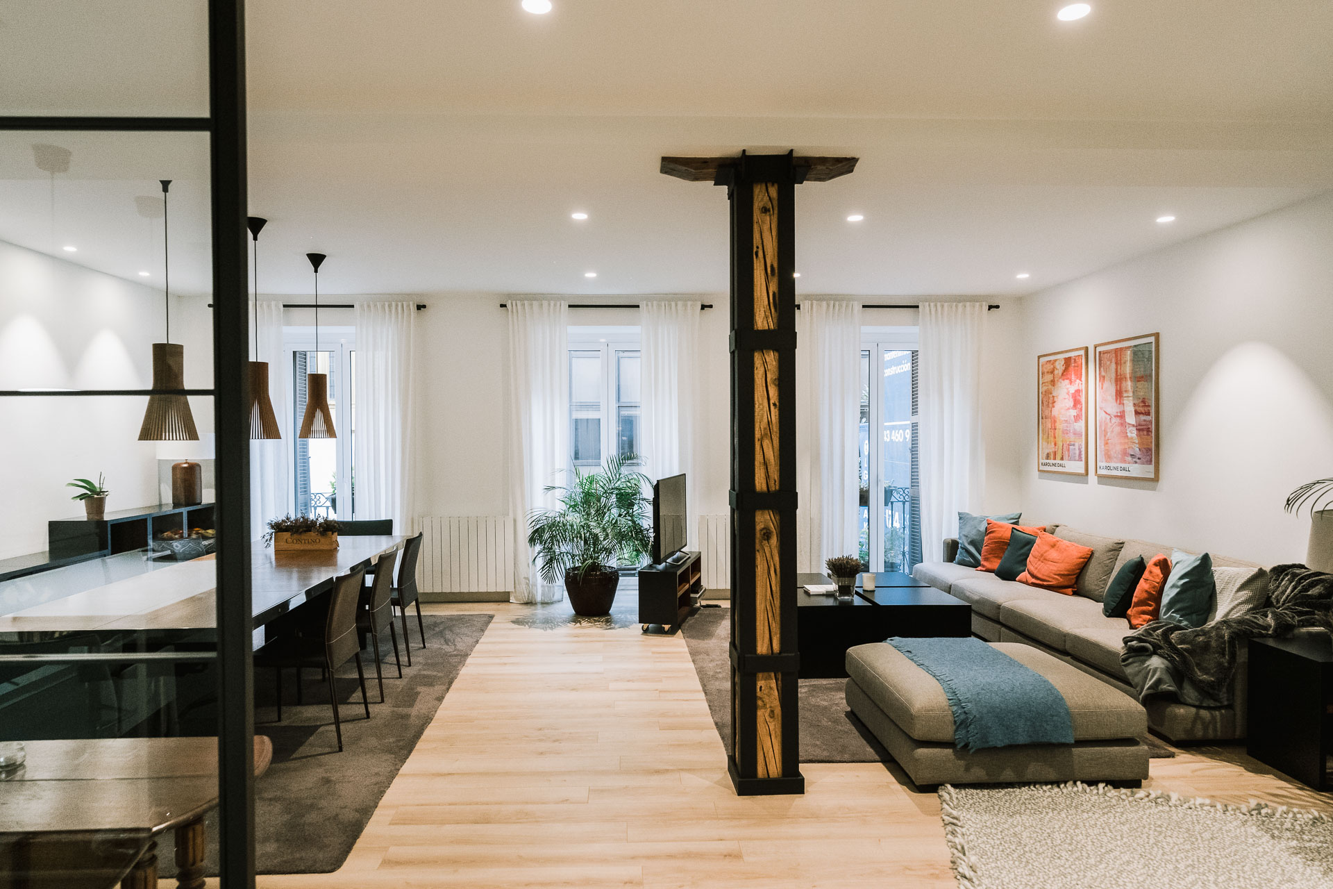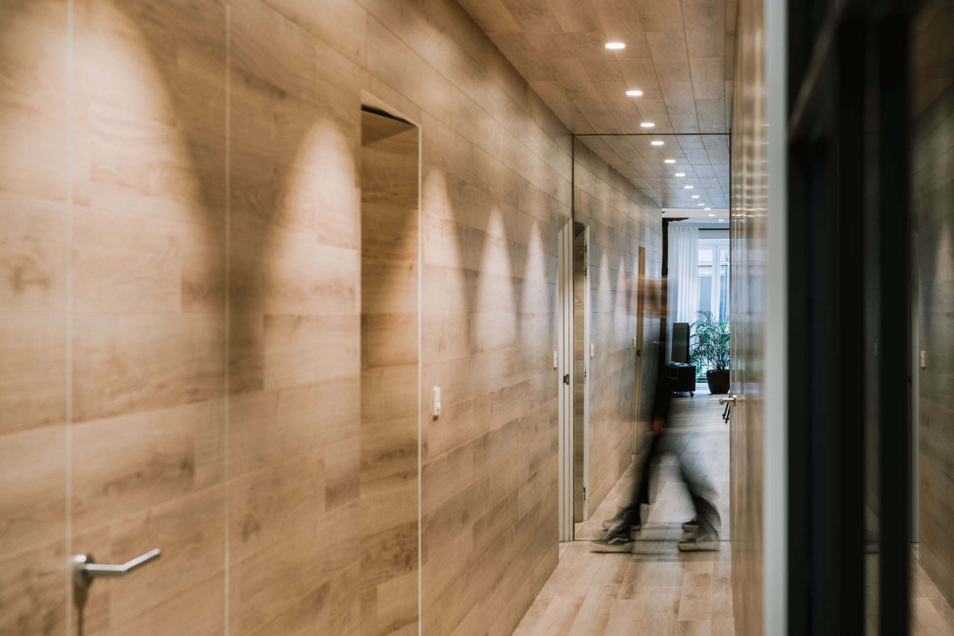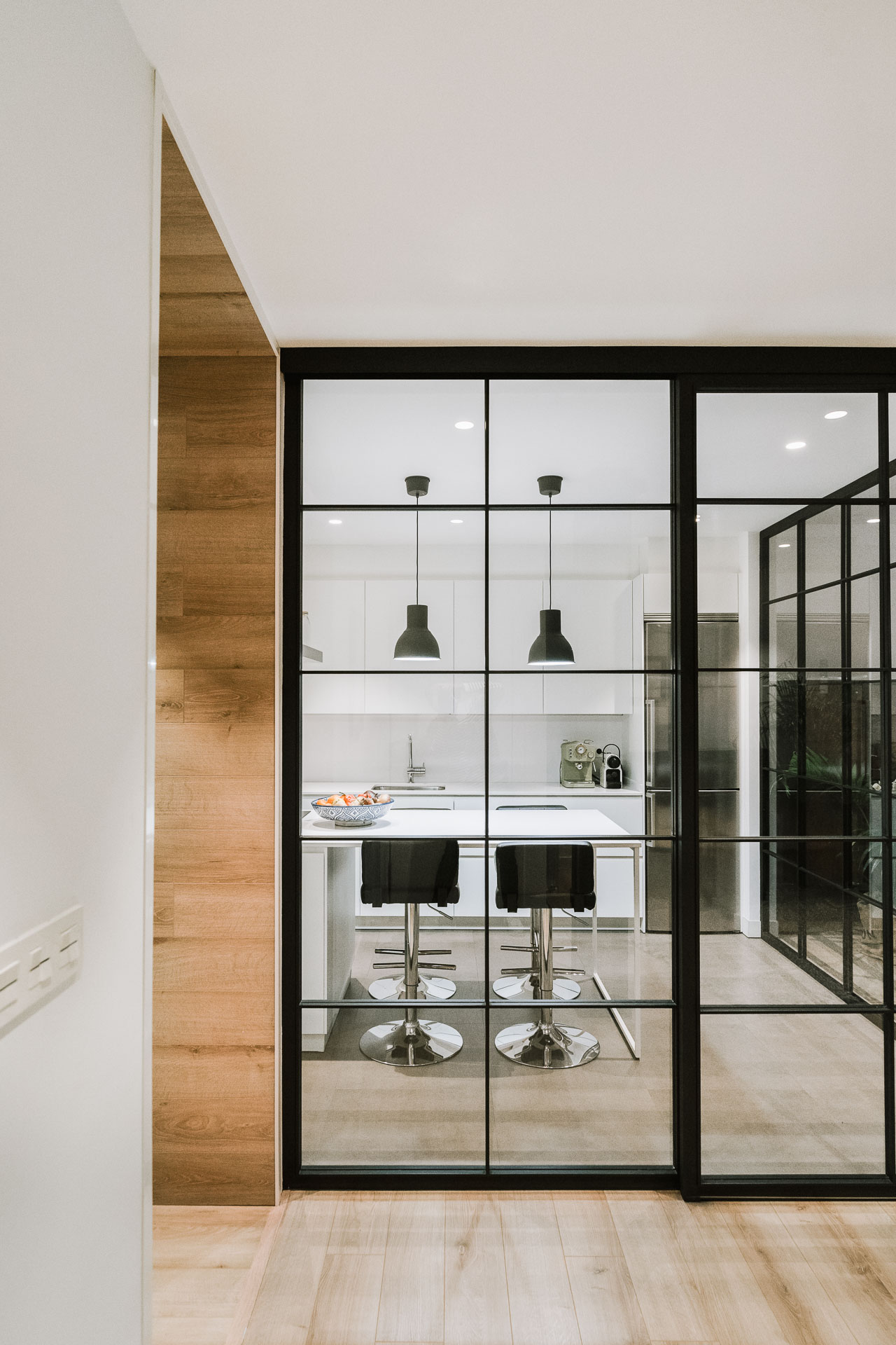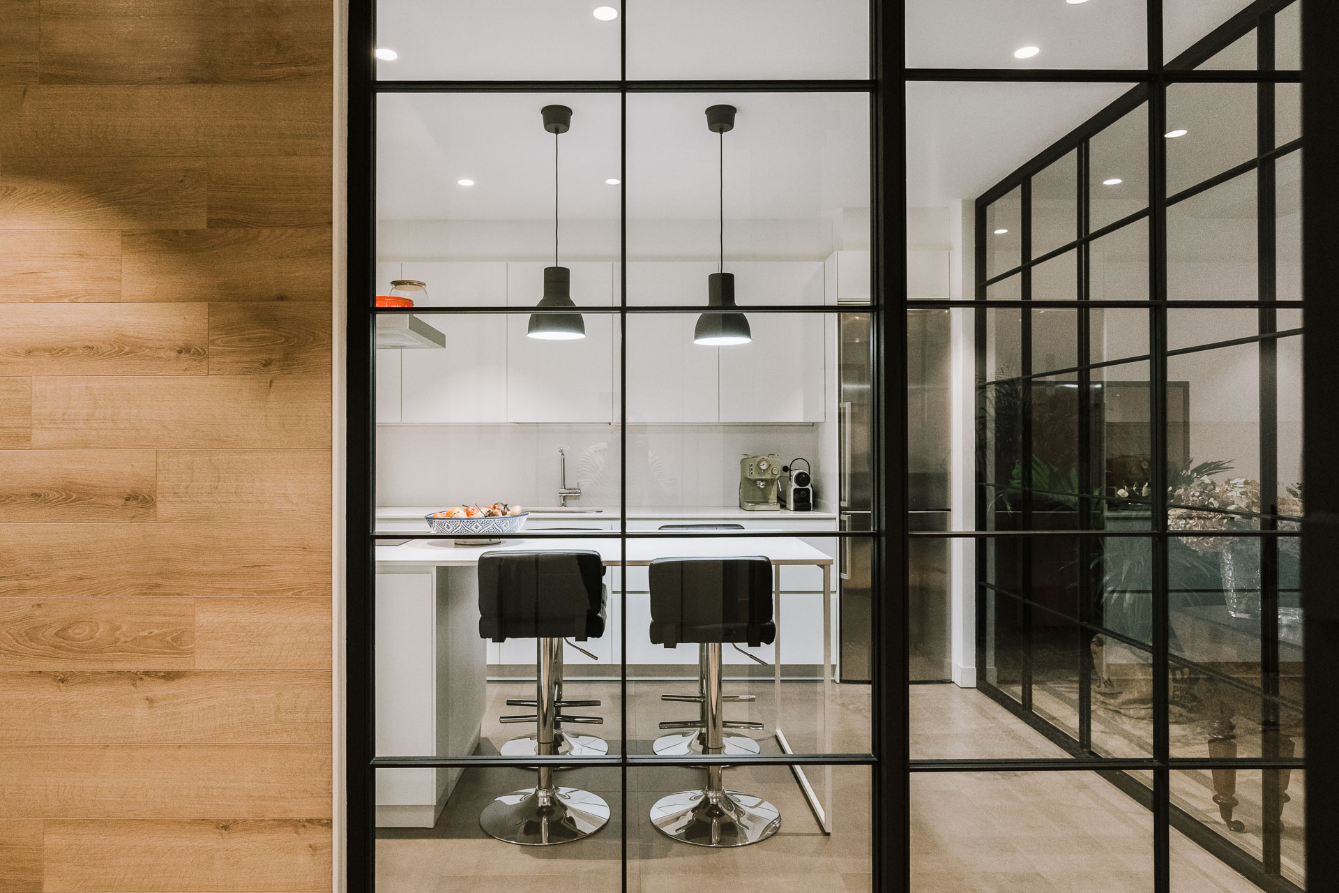 El proyecto de reforma integral de esta vivienda plantea unir dos antiguas viviendas en una única. Orientamos hacia la calle ppal los espacios de día, como son salón, comedor y una gran cocina conectada visualmente, pero cerrada mediante una división de forja y vidrio. Por otro lado, orientamos las habitaciones hacia el patio de manzana que dispone. Esto nos genera un gran pasillo de distribución al que decidimos revestir completamente en madera, inclusive techos y puertas, para crear un cajón de roble que se duplica mediante un espejo situado en el fondo del pasillo. De esta manera, se crea un espacio con juego y distinto a lo que estamos acostumbrados.