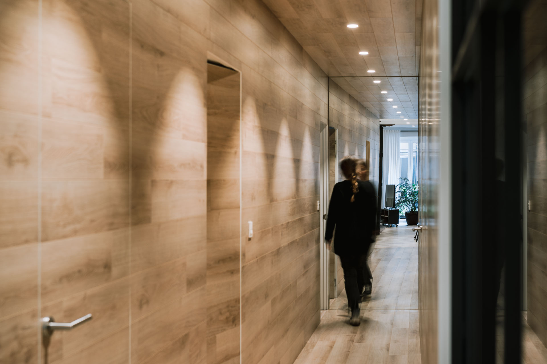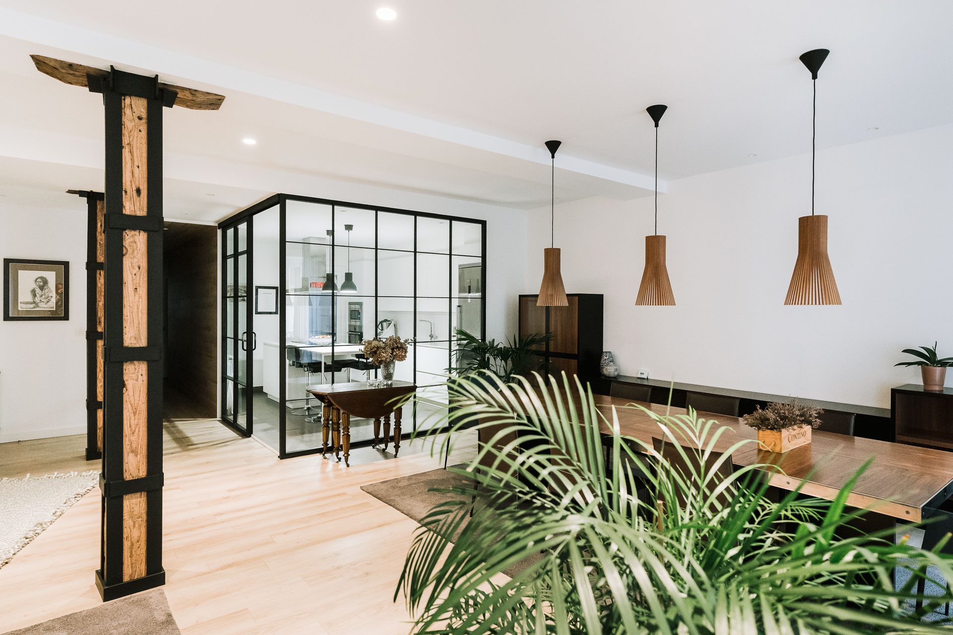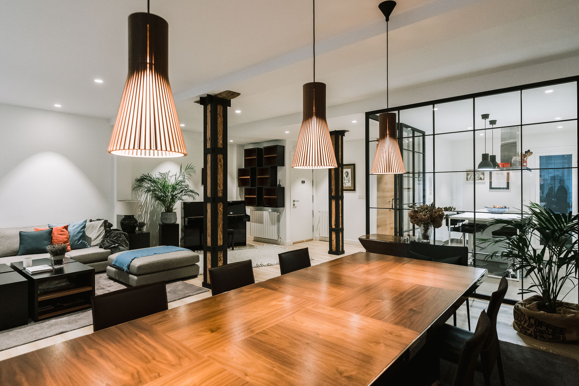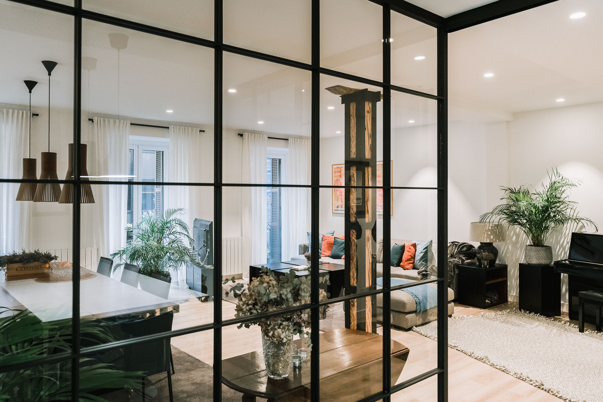 El proyecto de reforma integral de esta vivienda plantea unir dos antiguas viviendas en una única. Orientamos hacia la calle ppal los espacios de día, como son salón, comedor y una gran cocina conectada visualmente, pero cerrada mediante una división de forja y vidrio. Por otro lado, orientamos las habitaciones hacia el patio de manzana que dispone. Esto nos genera un gran pasillo de distribución al que decidimos revestir completamente en madera, inclusive techos y puertas, para crear un cajón de roble que se duplica mediante un espejo situado en el fondo del pasillo. De esta manera, se crea un espacio con juego y distinto a lo que estamos acostumbrados.