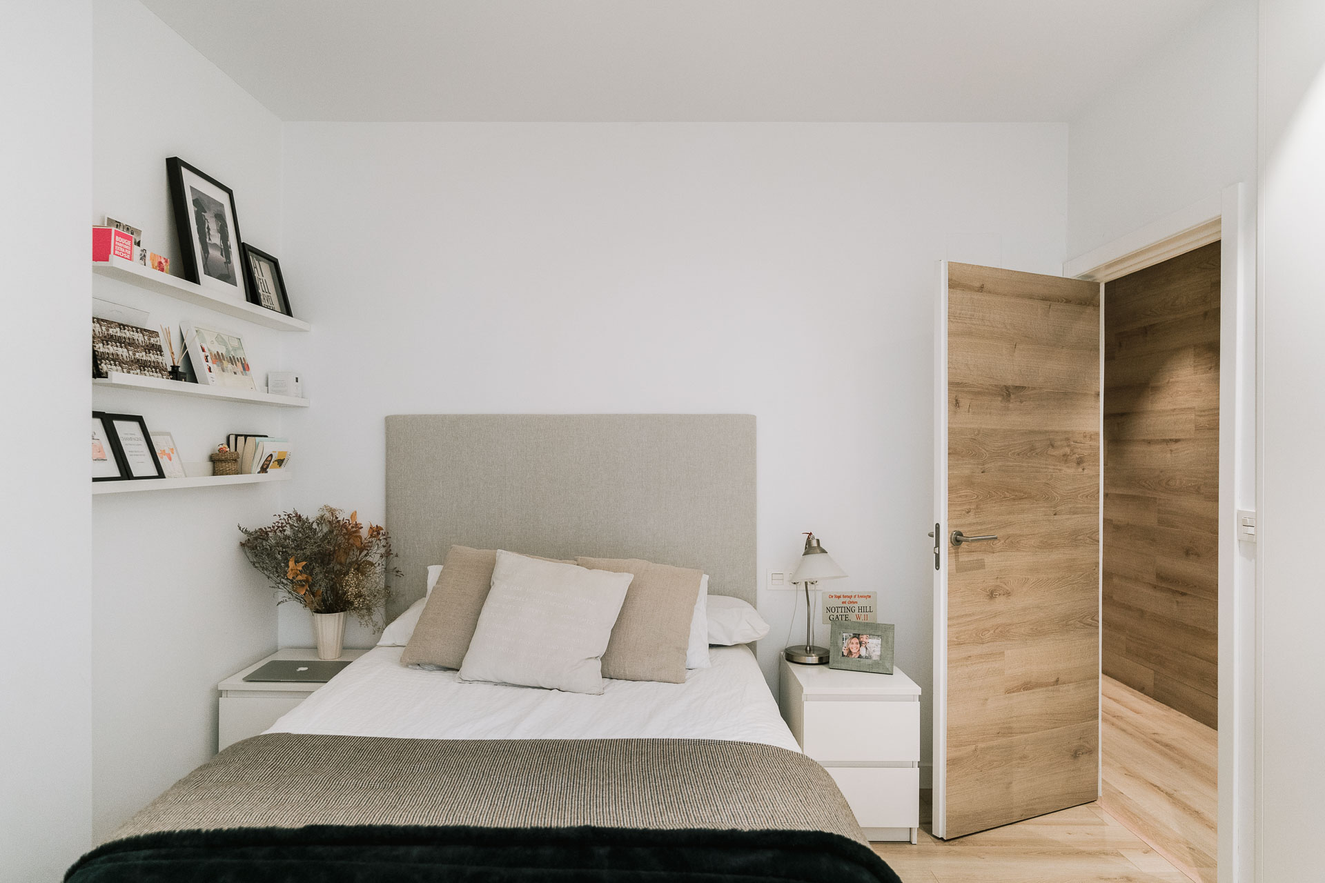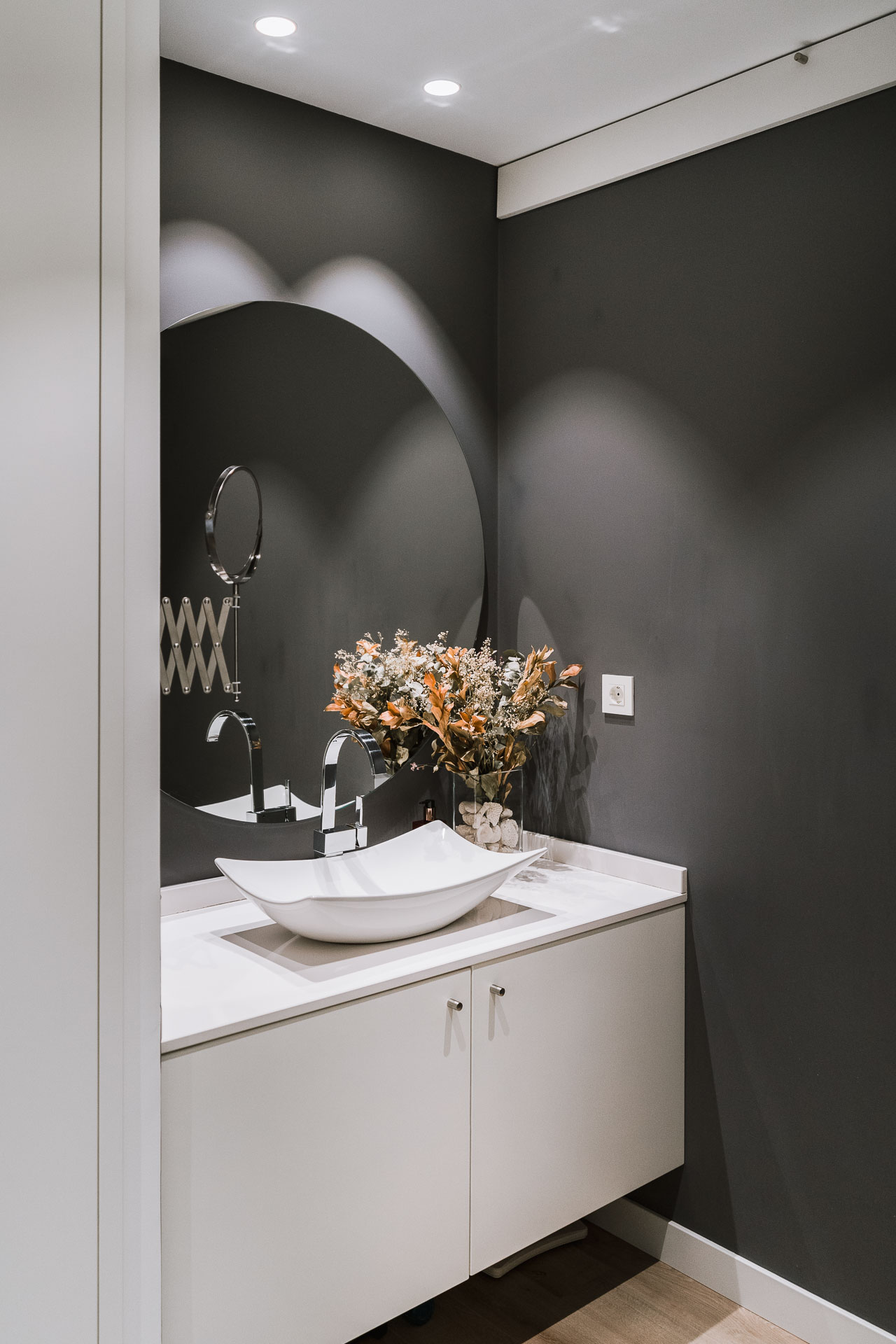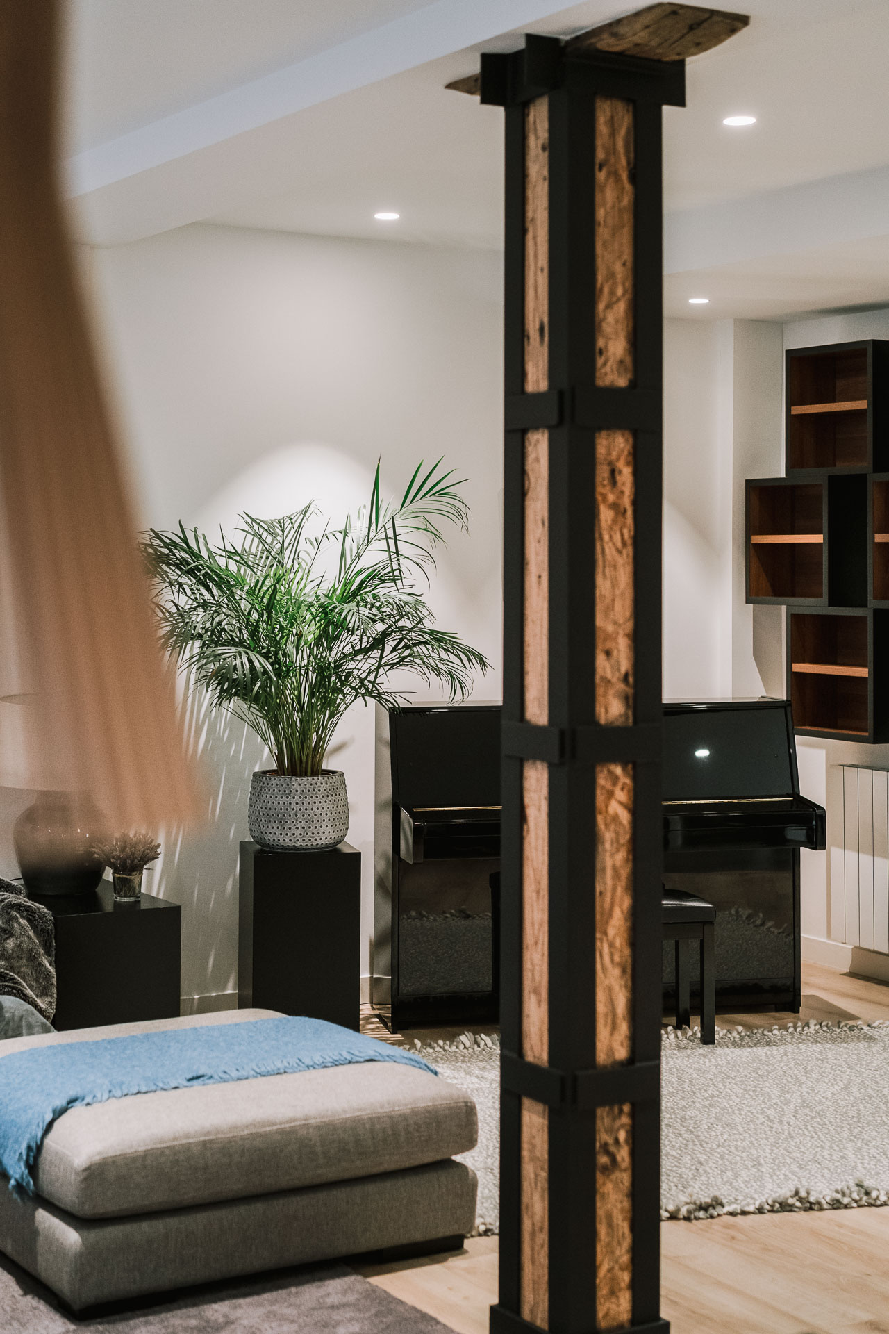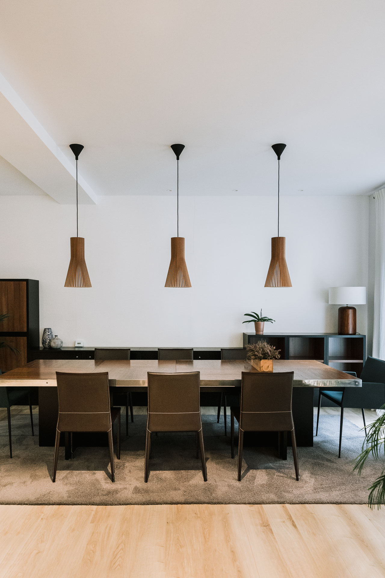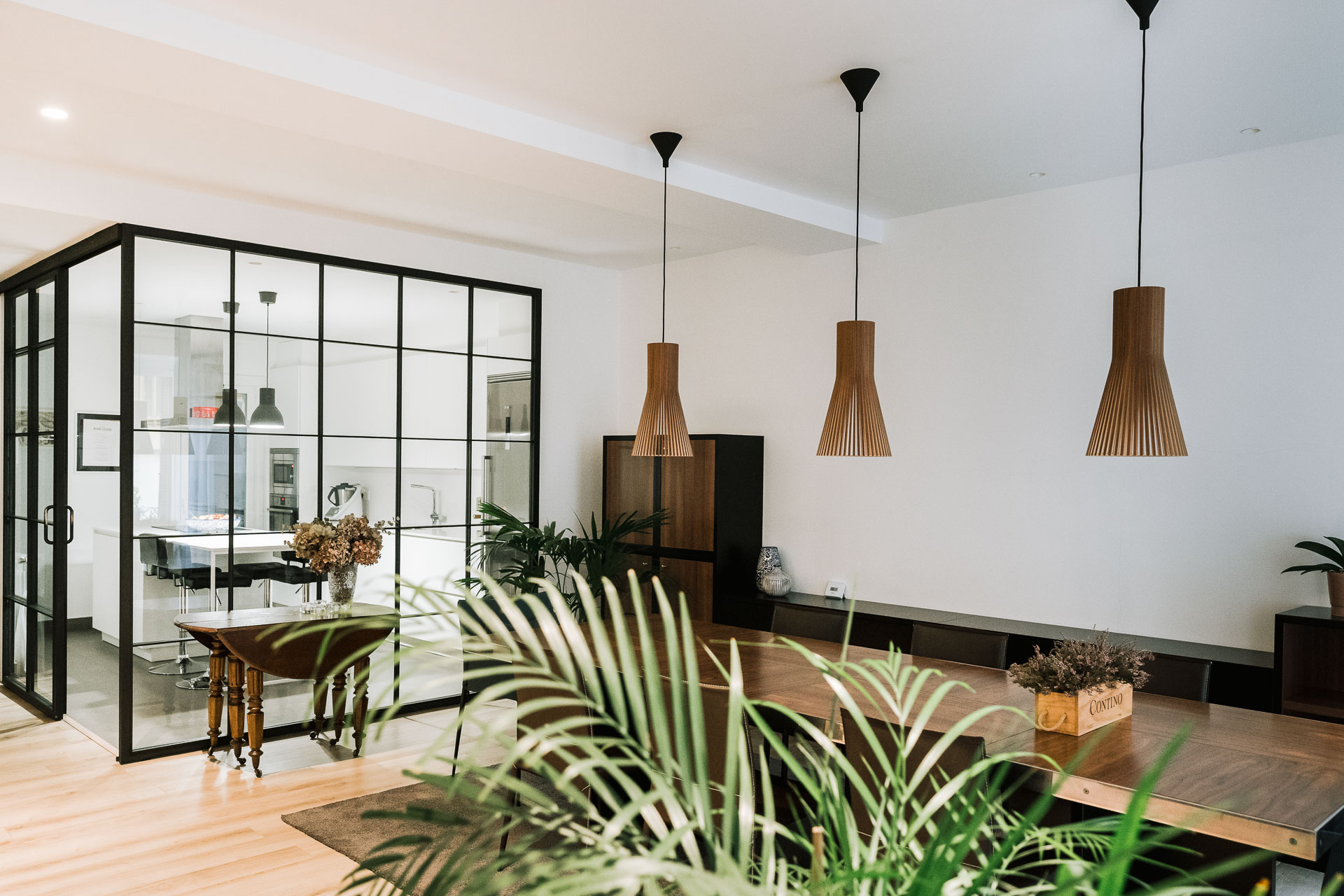 El proyecto de reforma integral de esta vivienda plantea unir dos antiguas viviendas en una única. Orientamos hacia la calle ppal los espacios de día, como son salón, comedor y una gran cocina conectada visualmente, pero cerrada mediante una división de forja y vidrio. Por otro lado, orientamos las habitaciones hacia el patio de manzana que dispone. Esto nos genera un gran pasillo de distribución al que decidimos revestir completamente en madera, inclusive techos y puertas, para crear un cajón de roble que se duplica mediante un espejo situado en el fondo del pasillo. De esta manera, se crea un espacio con juego y distinto a lo que estamos acostumbrados.