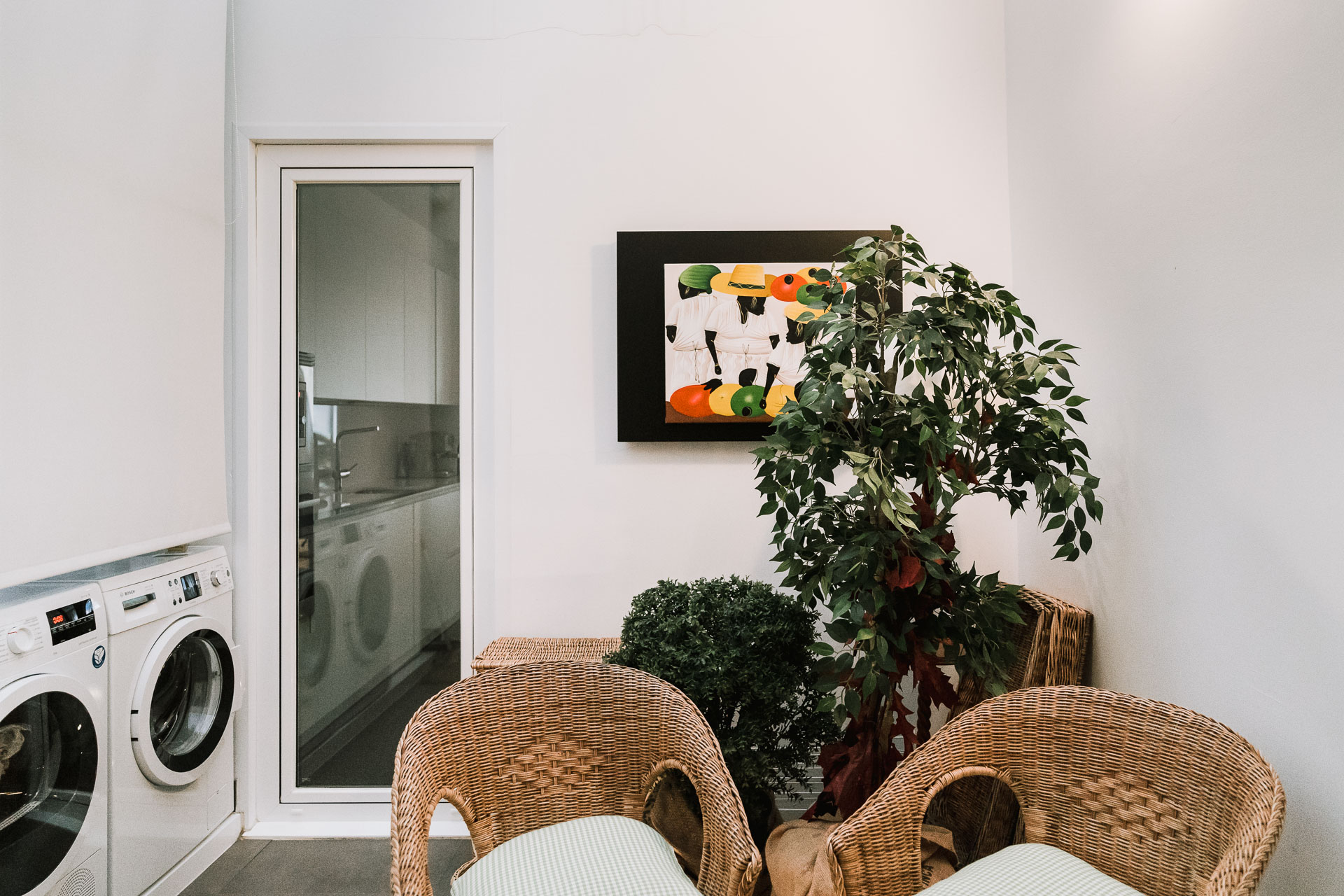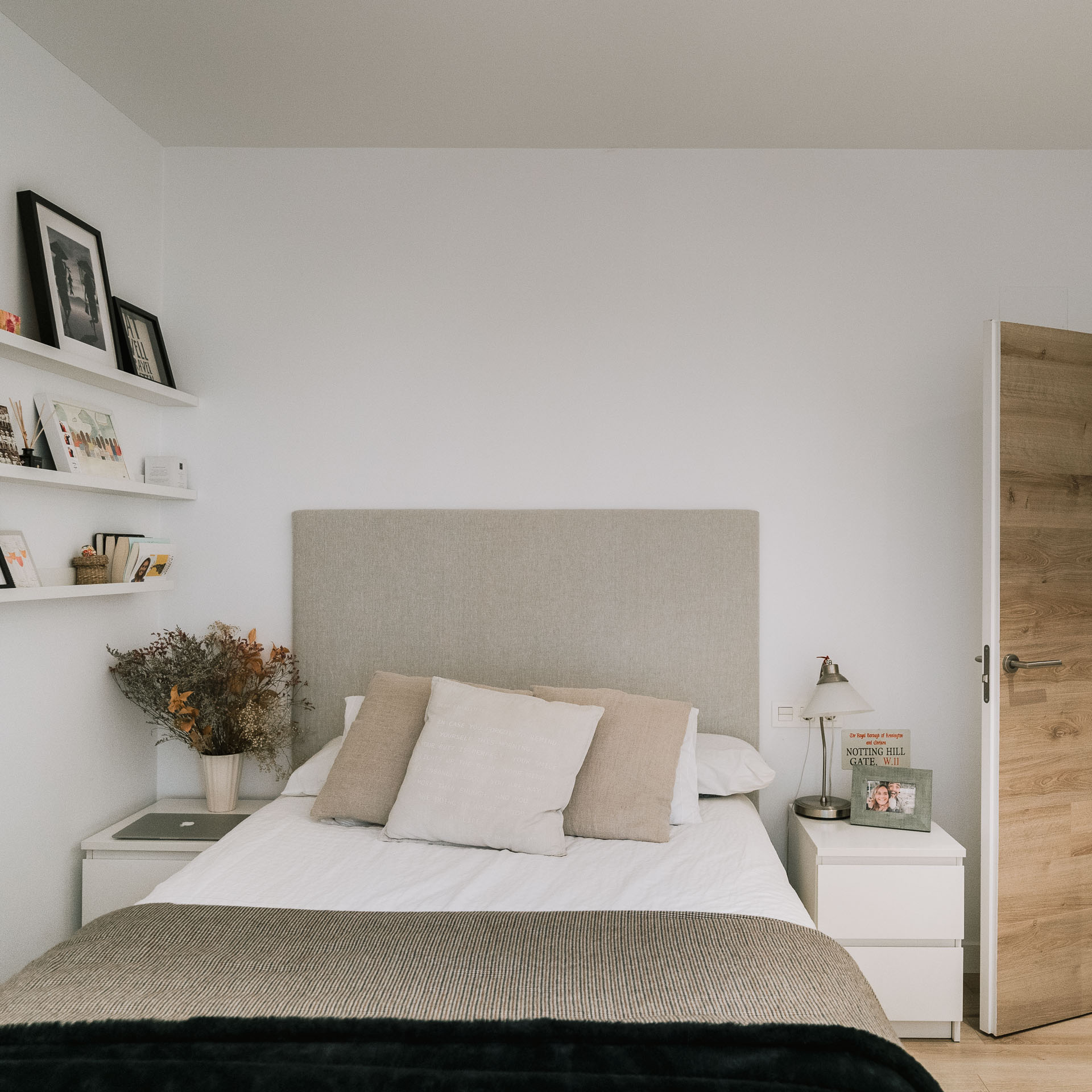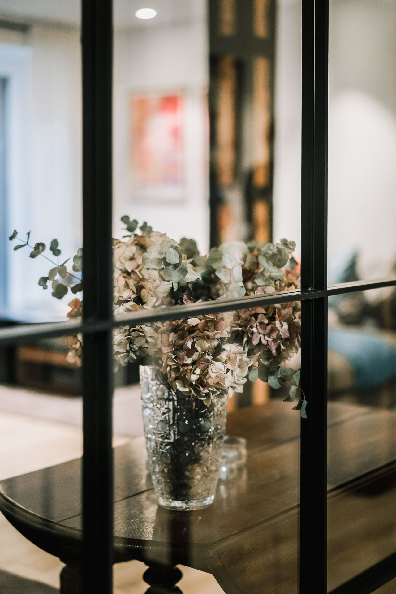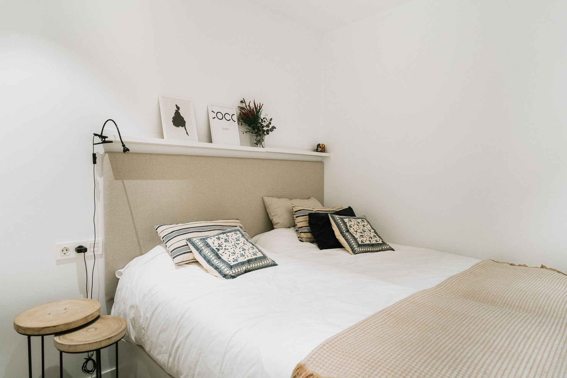 El proyecto de reforma integral de esta vivienda plantea unir dos antiguas viviendas en una única. Orientamos hacia la calle ppal los espacios de día, como son salón, comedor y una gran cocina conectada visualmente, pero cerrada mediante una división de forja y vidrio. Por otro lado, orientamos las habitaciones hacia el patio de manzana que dispone. Esto nos genera un gran pasillo de distribución al que decidimos revestir completamente en madera, inclusive techos y puertas, para crear un cajón de roble que se duplica mediante un espejo situado en el fondo del pasillo. De esta manera, se crea un espacio con juego y distinto a lo que estamos acostumbrados.